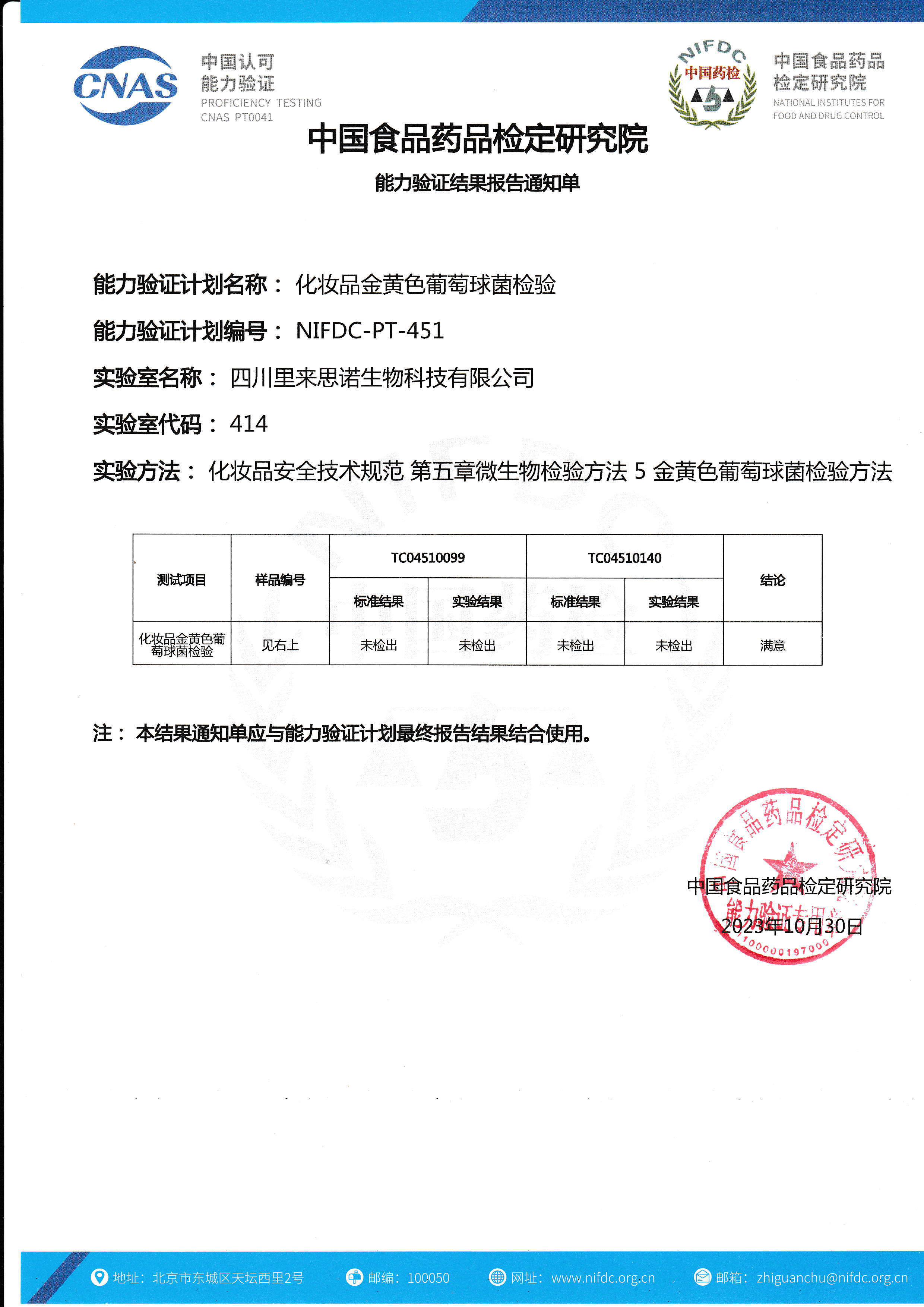 化妝品葡萄球菌檢驗CNAS能力驗證滿意證書