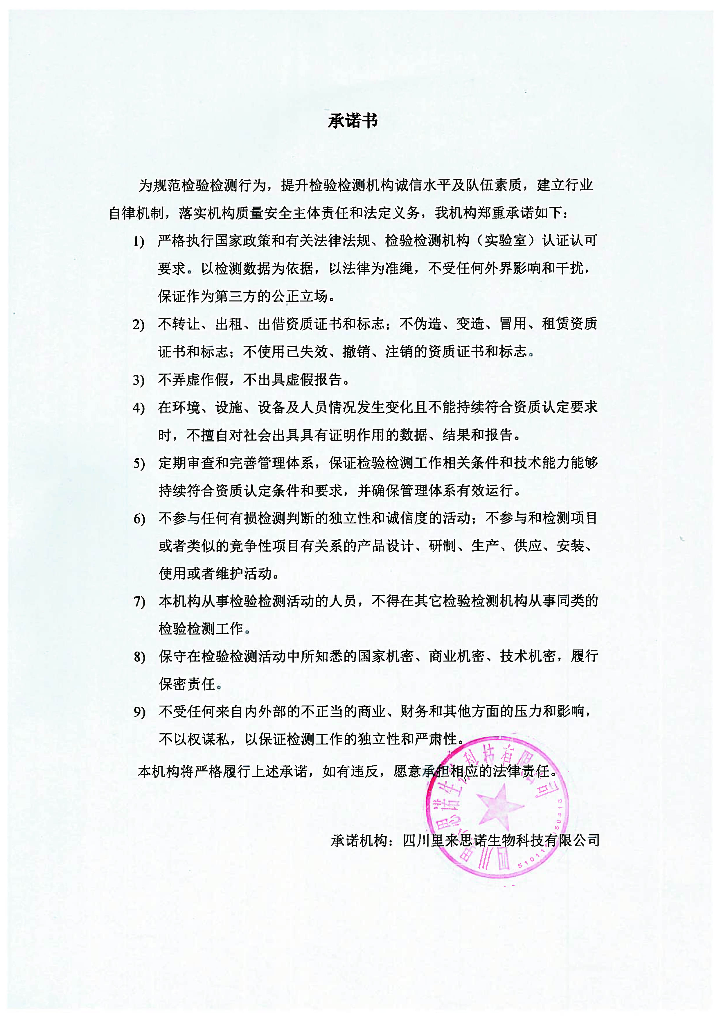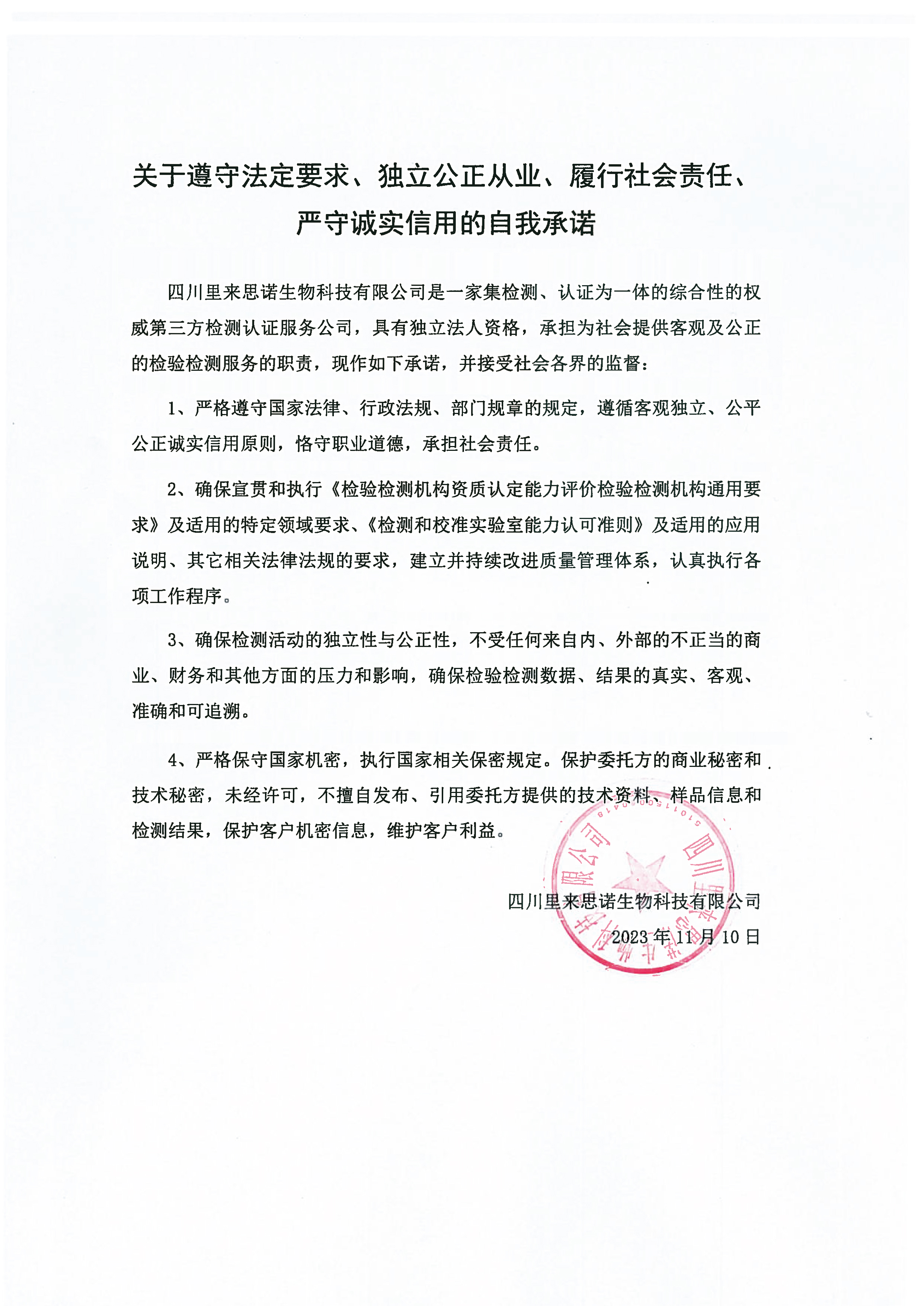 關(guān)于遵守法定要求、獨立公正從業(yè)、履行社會責(zé)任、嚴(yán)守誠實信用的自我承諾