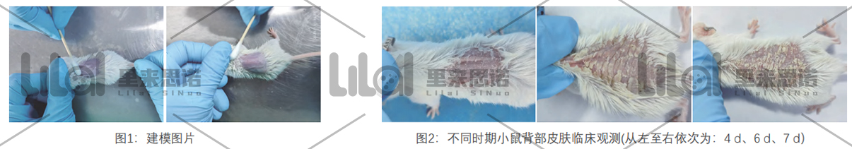 建模方法:剃除小鼠背部2cmx2cm大小區(qū)域的毛發(fā),使用棉簽蘸取藥膏均勻涂抹在小鼠裸露的背部,每天涂抹1次,連續(xù)涂抹7 d(如圖1所示)。