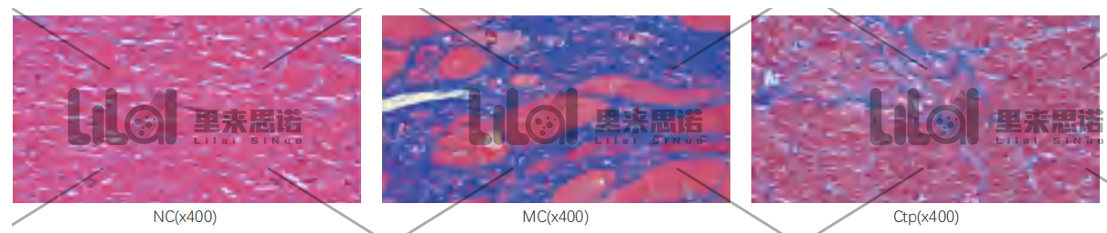 · Masson染色:與NC組相比,MC組大鼠膠原容積分數(CVF)顯著升高,心肌纖維化明顯增加(藍色增多),Ctp能減少心衰大鼠心肌纖維化(p<0.01)。