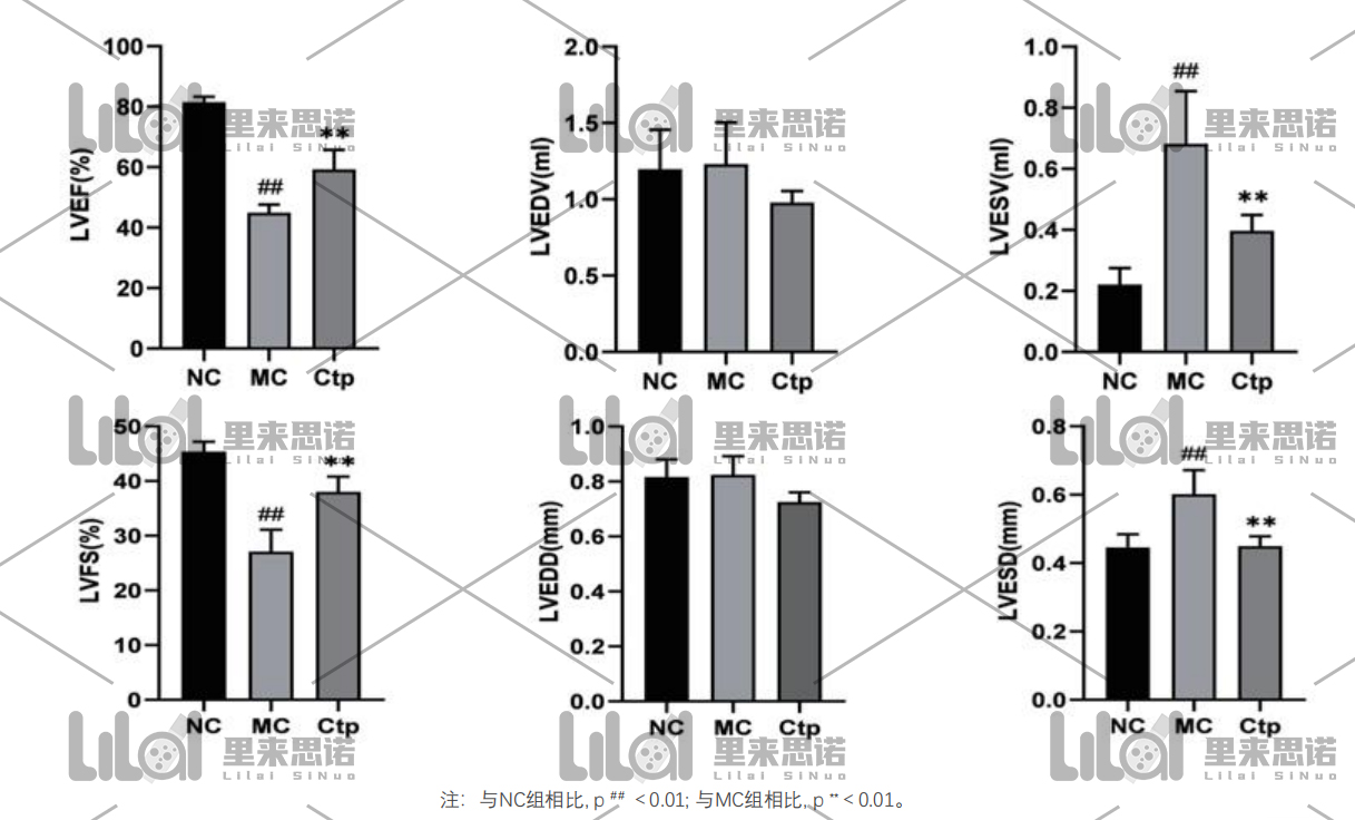 心功能檢測:實驗結束后進行心臟超聲,檢測各組大鼠的心功能。結果發(fā)現(xiàn):與NC組相比,MC組大鼠左室射血分數(LVEF)和左室短軸縮短率
