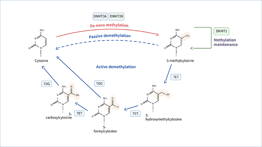 DNA甲基化通常抑制基因表達,去甲基化則誘導(dǎo)了基因的重新活化和表達。這種DNA修飾方式在不改變基因序列前提下實現(xiàn)對基因表達的調(diào)控。